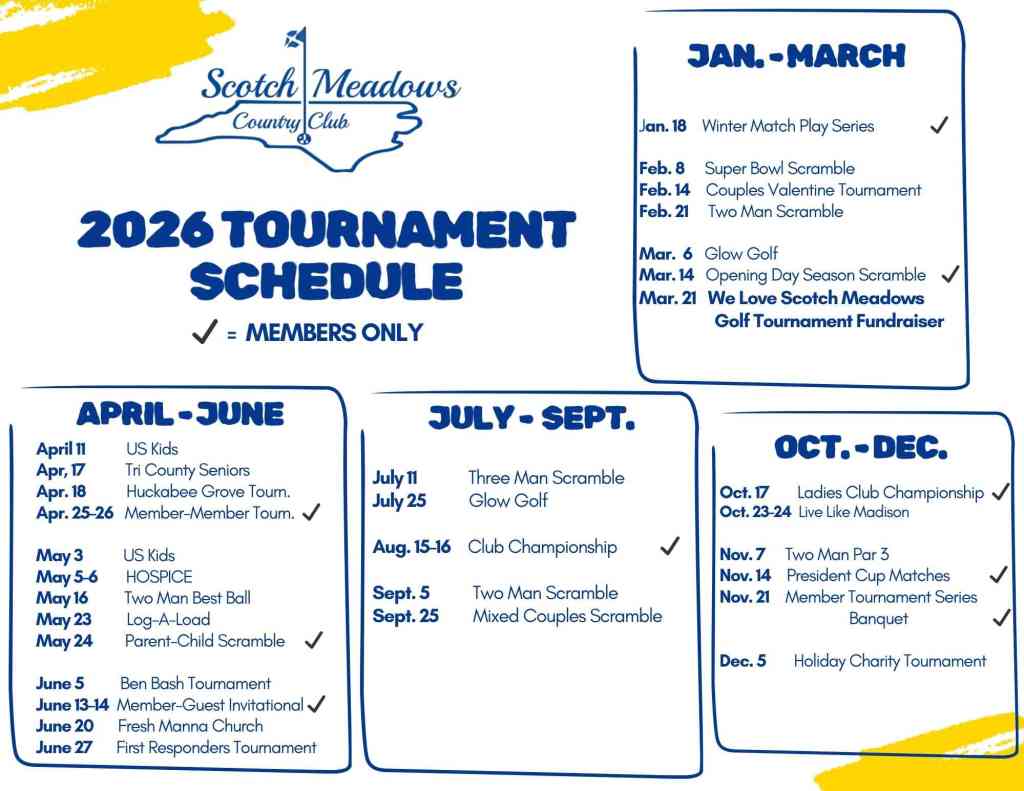 Events Wedding August 2025Wedding August 2025Wedding August 2025Wedding August 2025Wedding August 2025October 2025 WeddingOctober 2025 WeddingOctober 2025 WeddingOctober 2025 WeddingOctober 2025 Wedding The above photos are from various social events at Scotch Meadows over the past year. We look forward to hosting more events in 2026. Our Golf Tournament Schedule is below! Check back to see event calendars soon! 2026 Golf Tournaments